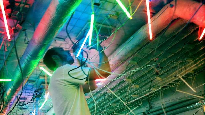 Olympus Photography Playground: SWARM The immersive, space-filling installation SWARM acts as an irregular, three-dimensional display. 1920 LEDs organized as a pointcloud in a 260 m3 space are hanging in various heights from the ceiling. Through the movement of the visitors within the installation the LEDs are lightening up and the static, chaotic structure transforms ... > show